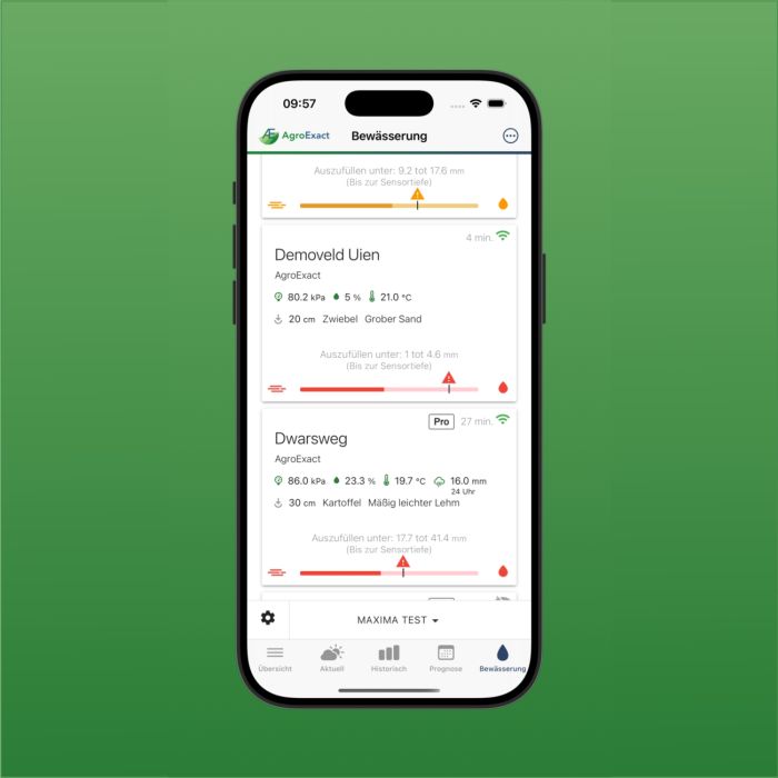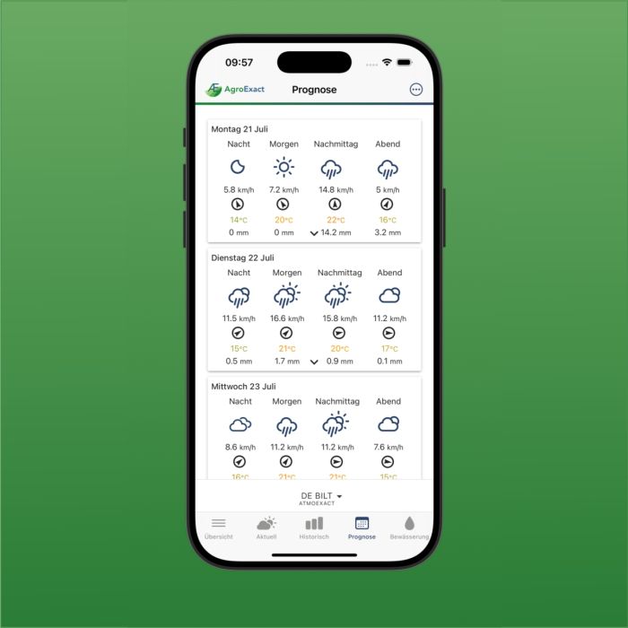 In der AgroExact-App können Sie diese Daten ganz einfach einsehen – nicht nur von Ihrem eigenen Standort, sondern auch von 5 weiteren Standorten Ihrer Wahl, die Sie für sich als relevant sehen. AgroExact prüft die Daten, damit Sie stets verlässliche Informationen erhalten.