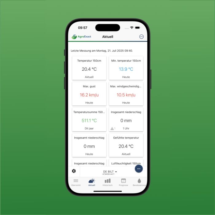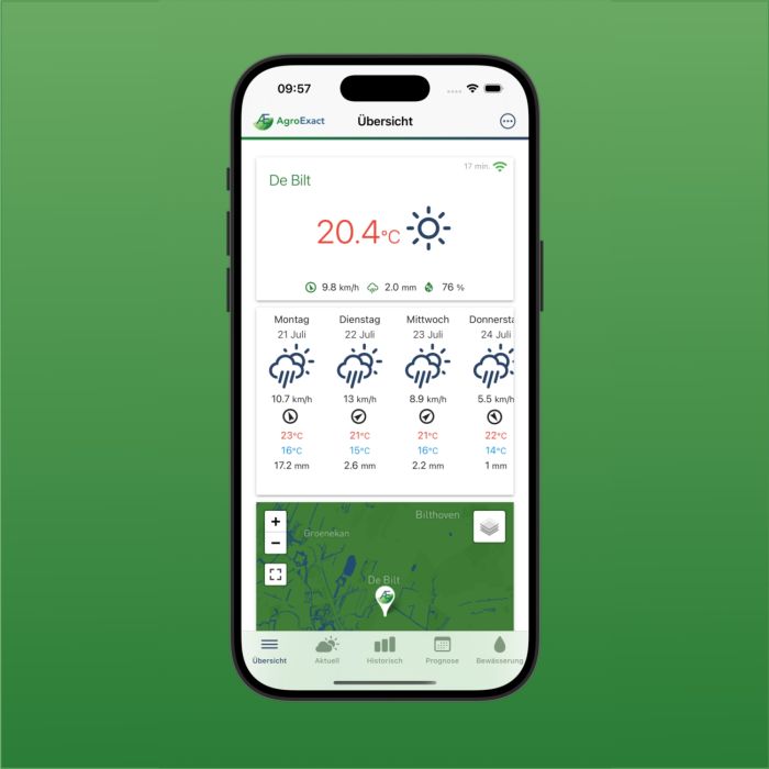 AgroExact entwickelt seit 2017 intelligente Wetterlösungen speziell für Ackerbaubetriebe und hat mittlerweile fast 1.000 Nutzer in Westeuropa. Mit einem eigenen Netzwerk von Wetterstationen, die über die AgroExact App zugänglich sind, können lokale Messungen von Niederschlag, Temperatur, Luftfeuchtigkeit und Windgeschwindigkeit für jeden Teilnehmer nachverfolgt werden. Darüber hinaus bietet AgroExact Erweiterungsmöglichkeiten für die Messung von Bodenfeuchte und Mikroklimatologie in der Kultur. So können Sie genauer planen, unnötige Fahrten vermeiden und bessere Entscheidungen für Ihre Kultur und Ihren Boden treffen.