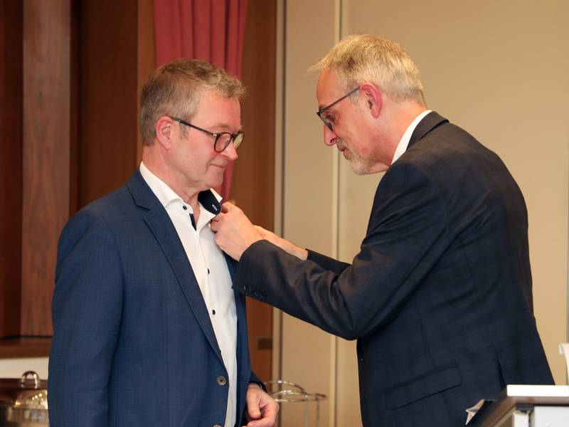 Für Josef Mescher stellte 1987 die Ausbildung zum Bankkaufmann bei der damaligen Raiffeisenbank Dörpen die erste genossenschaftliche Station dar. Mit seinem Herz für den Vertrieb schaffte er bereits 1990 den Karrieresprung zum Geschäftsstellenleiter. Als er 2004 zur heutigen Raiffeisenbank Ems-Vechte wechselte, übernahm er die Leitung für die Geschäftsstelle in Sögel. Prokura folgte im März 2006; Vertriebsleiter wurde er 2012, bis er im März 2019 in den Vorstand berufen wurde. „Zusammen mit deinen Vorstandskollegen hast du die in den Jahren deiner Vorstandstätigkeit bestehenden Herausforderungen mit Bravour gemeistert und die Raiffeisenbank Ems-Vechte zu einer modernen und erfolgreichen Genossenschaftsbank sowie einem leistungsstarken Agrarhändler entwickelt“, würdigte Schwengels das Engagement von Mescher und verlieh auch ihm die Goldene Ehrennadel. „Deine regionale Verankerung, deine stetige Bereitschaft zur Übernahme von Verantwortung sowie dein nachhaltiges Handeln, stets gepaart mit deiner großen Verlässlichkeit, haben dir die uneingeschränkte Hochachtung deiner Mitglieder, Kunden, Mitarbeiter sowie deines Aufsichtsrates und des Beirates eingebracht.“